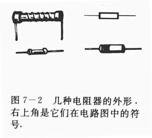 在电子技术中,要经常用到具有一定阻值的元件一电阻器,也叫做定值电阻,简称电阻(图7-2)