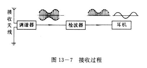 接收电磁波需要有接收天线。天线可以接收到各种频率的电磁波.为了从中选出我们需要的某一频率的电磁波,并把它变成电流,要采用一个可以调节的电路——调谐器。从调谐器得到的是我们需要的带有率音信号的高频振荡时流,为了把声音信号取出来,还要使它通过检波器,从检波器出来的电流通过耳机,就还原成声音。